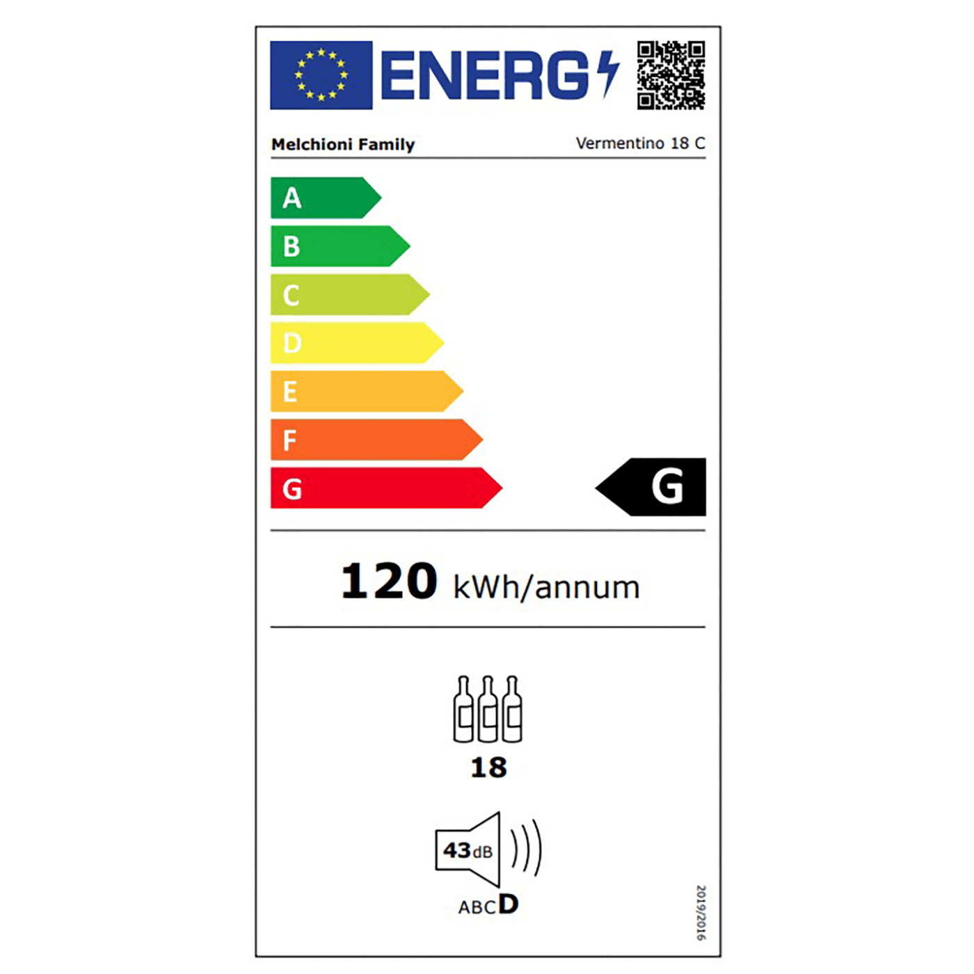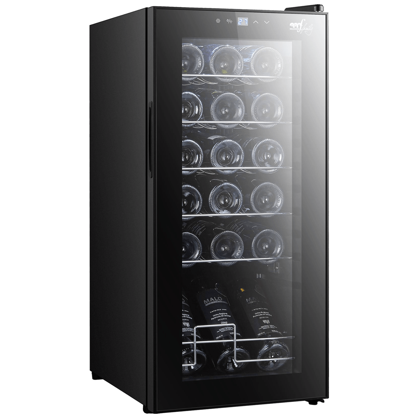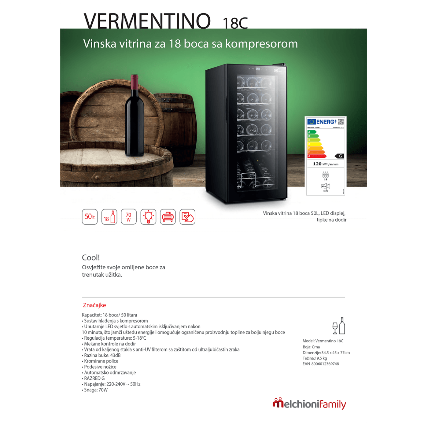 Rashladna vinska vitrina, kapacitet 18 boca, zapremina 50 litara, sustav hlađenja s kompresorom, unutarnje LED svjetlo, regulacija temperature 5 - 18°C, zaslon na dodir s prikazom temperature, vrata od kaljenog stakla sa UV filterom, kromirane police, razina buke 43dB, energetski razred G.