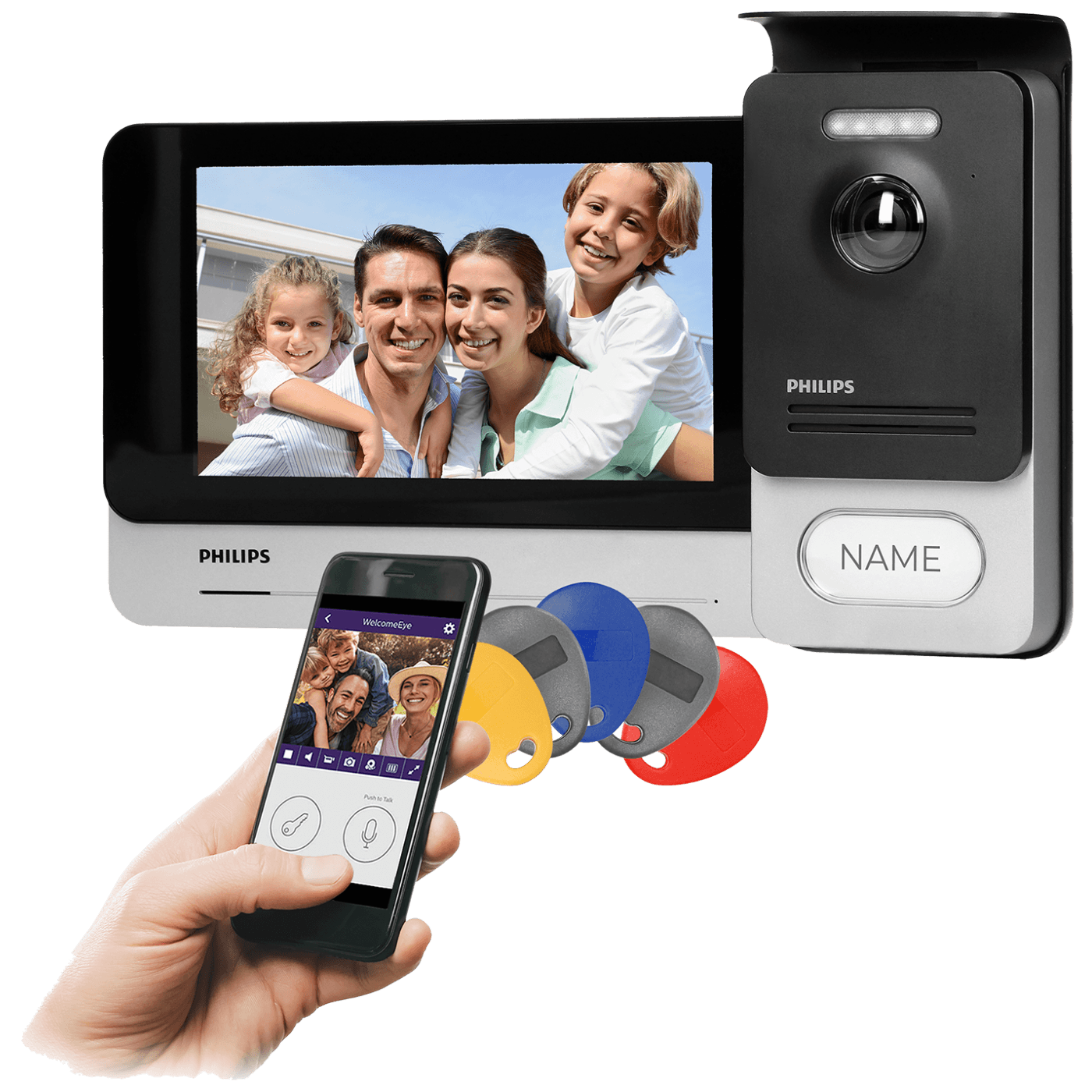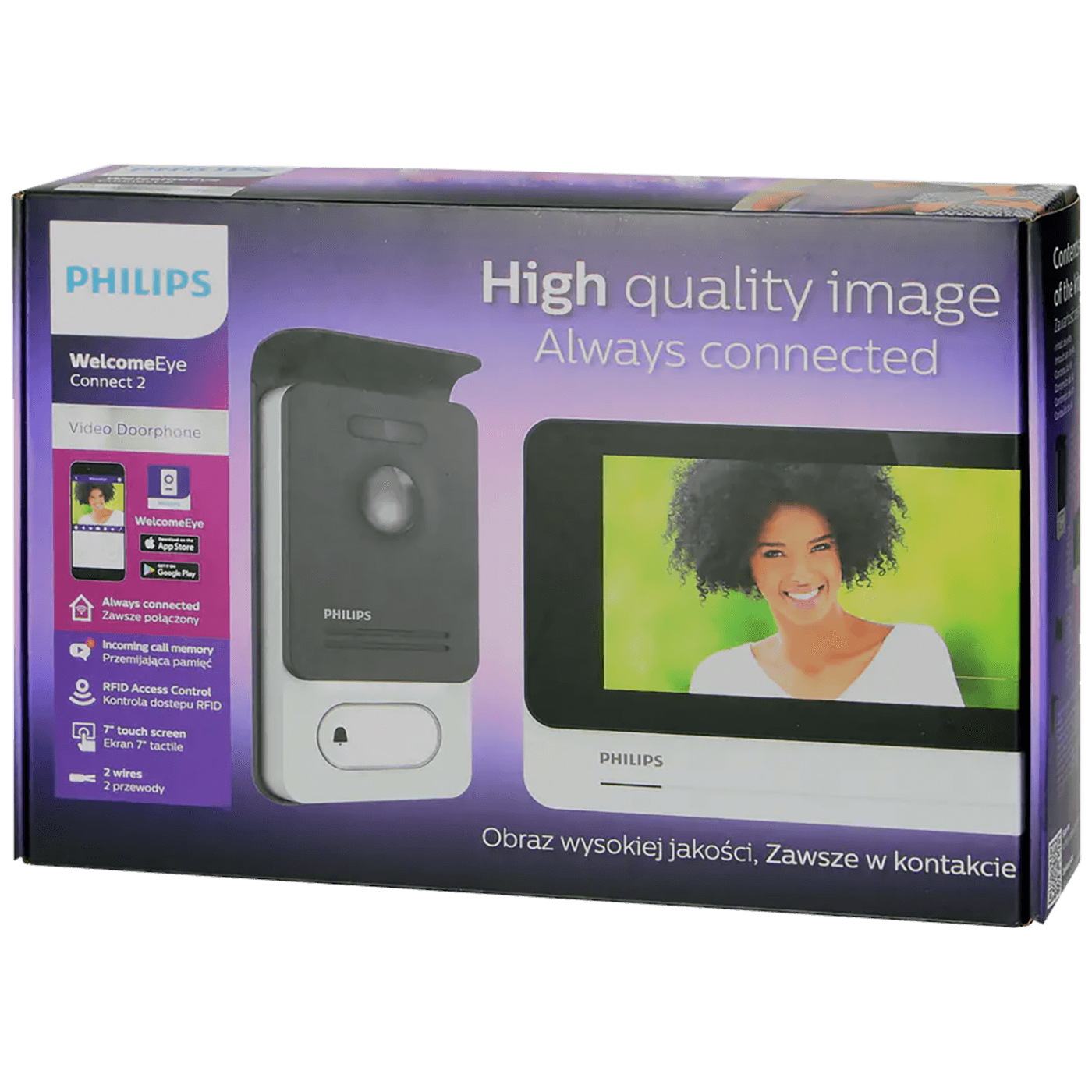 Philips WelcomeEye Connect video interfon set uključuje 7-inčni pun ekran osjetljiv na dodir s podesivom jačinom zvuka i parametrima slike i 6 melodija zvona koje možete izabrati. Upravljajte putem aplikacije za telefon/tablet za Android i iOS: posmatrajte, razgovarajte i odobrite pristup svom domu pomoću aplikacije WelcomeEye. Širokokutna vanjska kamera pruža najkvalitetniji snimak, a pozadinsko osvjetljenje vanjskog panela sa svijetlim LED diodama omogućava odličnu vidljivost čak i u mraku. Izdržljiva i otporna na oštre vremenske uslove, vanjska kaseta ima ugrađen čitač kartica i tag ključa. Dodatne funkcije: interfon (nakon povezivanja dodatnog monitora), funkcija snimanja slike, kontrola kapije i mogućnost proširenja sa dodatnim dodacima iz serije. 7" monitor, rezolucija 800 x 480, WiFi 2.4 GHz, memorija, utor za SD karticu, interkom funkcija, 6 melodija zvona, dimenzije 210 x 142 x 15 mm Kamera ( vanjska jednica ), ugao gledanja vertialno / horizontalno - 90° / 130°, rezolucija 900 TVL, RFID čitač kartica i tag ključa, noćno osvetljenje bijela LED, IP44, dimenzije 82 x 168 x 38 mm
